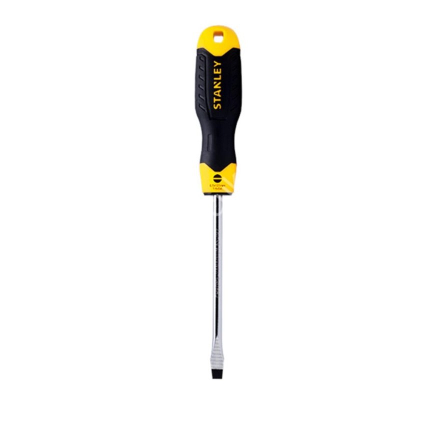 Stanley cushion grip flat screwdriver 5 x 150mm Chrome Vanadium (Cr-V) blade for durability Magnetic tips for easy pick up and screw locator Ergonomic design with finger point in neck-down area for precise control Size : 5 X 150MM Made in China Built-in hang hole for easy storage